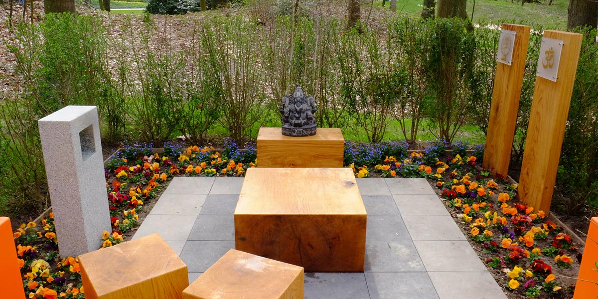 Im Garten der Hindus symbolisiert eine Statue des Gottes Ganesha das Göttliche. In den Hindu-Traditionen gibt es eine unüberschaubare Zahl an Göttinnen und Göttern, die für unterschiedliche Lebensbereiche zuständig sind. In diesem Garten wird Ganesha als gnädiger, gütiger, freundlicher, humorvoller, kluger, und menschlicher Gott vorgestellt. Er ist einer der populärsten Götter überhaupt. Er ist der Sohn des Shiva und der Parvati, mit denen er zusammen das Idealbild einer Hindu-Familie verkörpert.