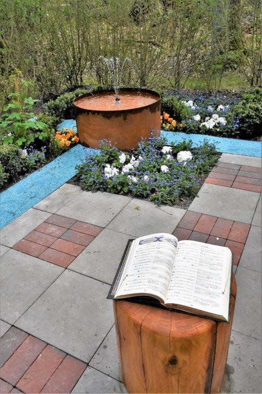 Vier Flüsse, hier durch Glassplitt symbolisiert, erinnern an Ströme des Lebens: Honig, Wasser, Wein, Milch (Koran, Sure Mu-hammad 47:15).