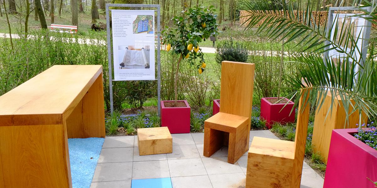 - Die Schrift, also die Bibel, Hebräisch TaNaKh (= Thora [Weisung, Lehre] – die 5 Bücher Mose, Neviim – die Propheten und Khetuvim – Schriften, z. B. die Psalmen). Im Garten gibt es einen langen Tisch, um die Schriftrollen auszurollen, denn die Bibel für den religiösen Gebrauch hat Rollenform (Thora) und Buchform.