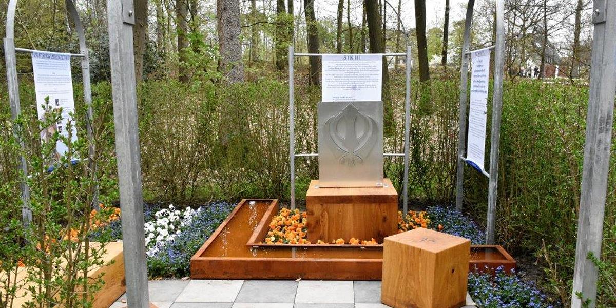 Durch eines von 4 angedeuteten Toren betritt man den Garten der Sikh. Dieser Garten ist ein Ausschnitt eines spiegelsymetrischen Gartens. Auch der bekannteste Tempel der Sikh, der Goldene Tempel in Amritsar, kann durch 4 Tore aus 4 Himmelsrichtungen betreten werden. Das heißt: alle Menschen aus allen Richtungen sind willkommen, ungeachtet ihrer Herkunft, Tradition oder Religion.